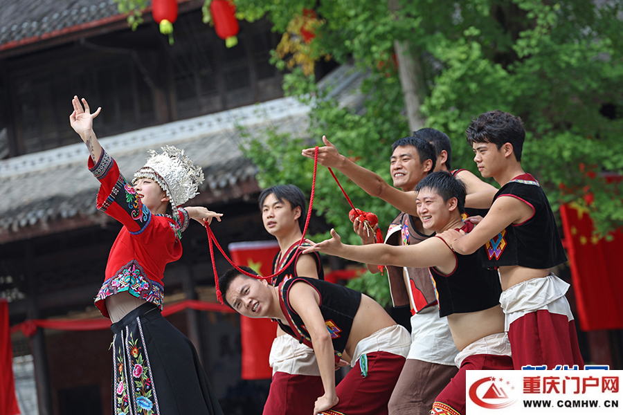 9月29日,在重庆市彭水苗族土家族自治县蚩尤九黎城景区,精彩的歌舞表演为游客带来一场独特的视觉盛宴。新华网发(赵勇 摄)